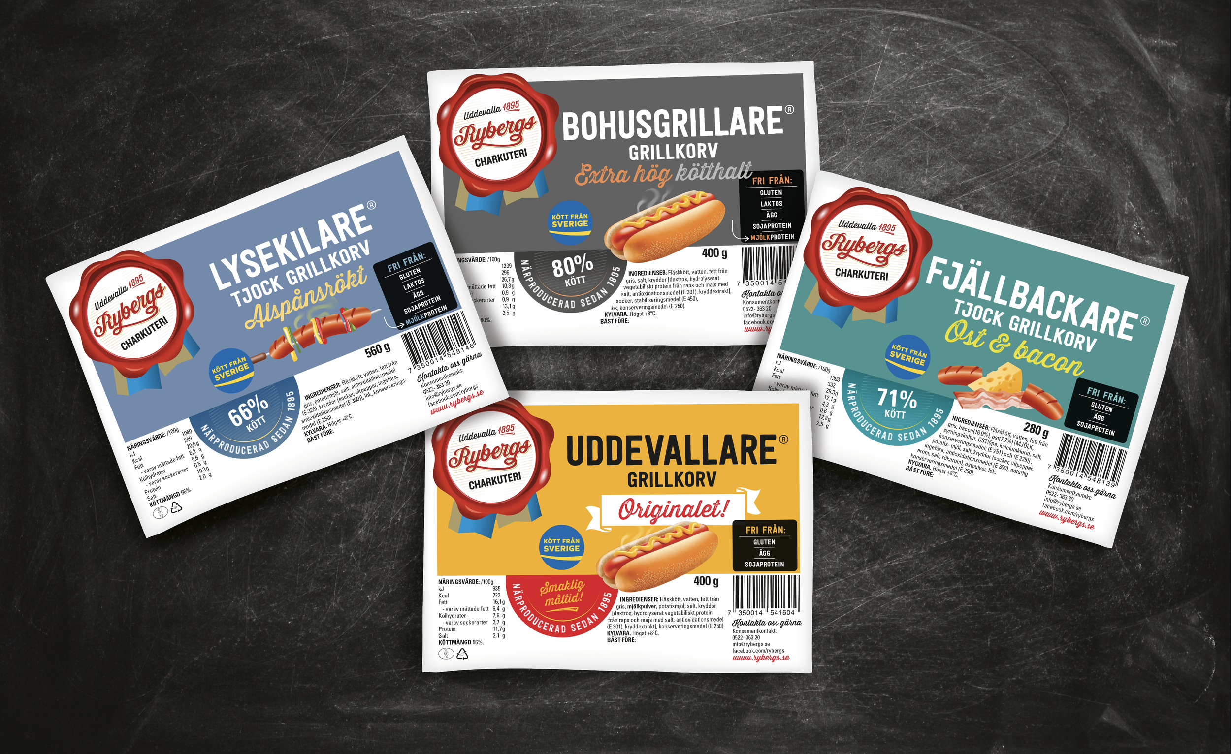 Vi vill med den nya designen lyfta fram skillnaderna mellan Rybergs olika grillkorvar, så att det blir enklare att välja i hyllan. På förpackningen framgår det också mer tydligt vad produkten är ”Fri Från” Ex. att Bohusgrillare är fri från mjölk, och har extra hög kötthalt.